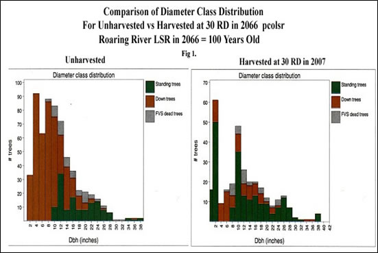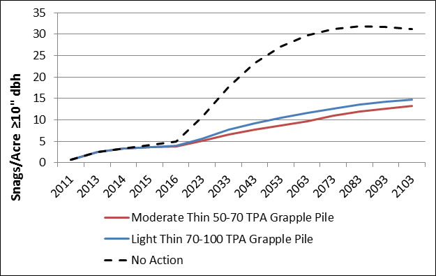 Notice, that for this particular site and treatments, there will be significantly fewer snags >10" dbh for at least 10 to 80 years post-treatment.